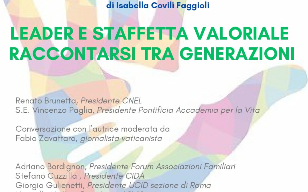 ricordiamo l’appuntamento promosso dalla Sezione di Roma di Martedì 4 marzo alle ore 15.00 LEADER E STAFFETTA VALORIALE RACCONTARSI TRA GENERAZIONI presentazione del libro “Non possiamo salvare il mondo ma ci proviamo: nonni e nipoti si educano a vicenda” assieme all’autrice Isabella Covili Faggioli e ad autorevoli relatori, organizzata dalla Prof.ssa Cinzia Rossi insieme ai componenti la Commissione Formazione Etica a supporto della Dottrina Sociale della Chiesa, che si terrà presso il CNEL, Plenaria “Marco Biagi”, via David Lubin 2.