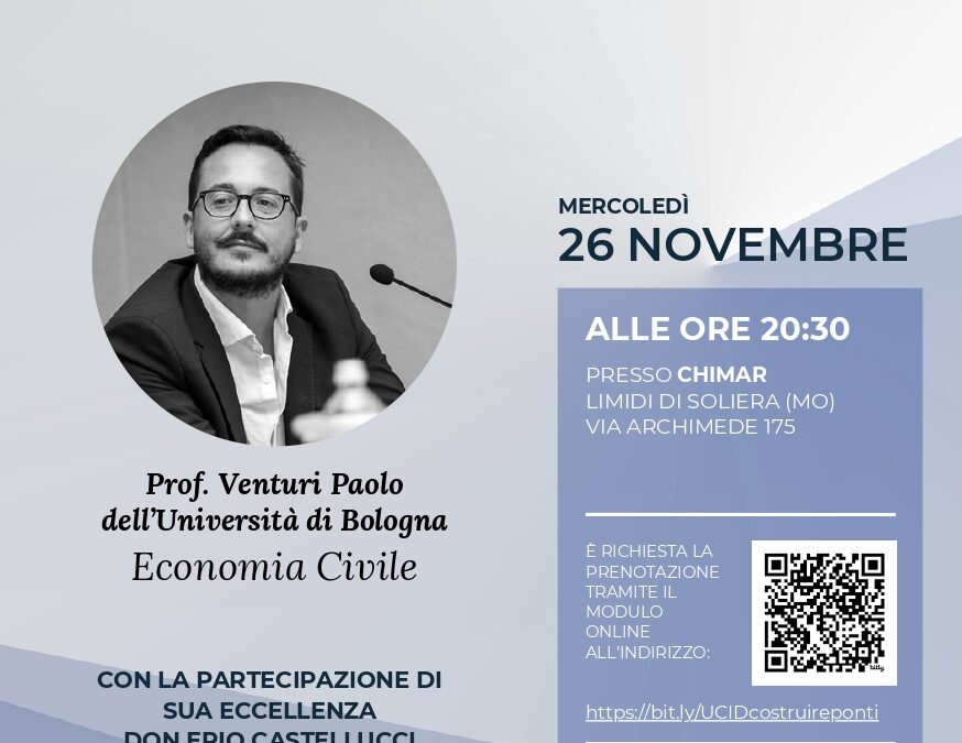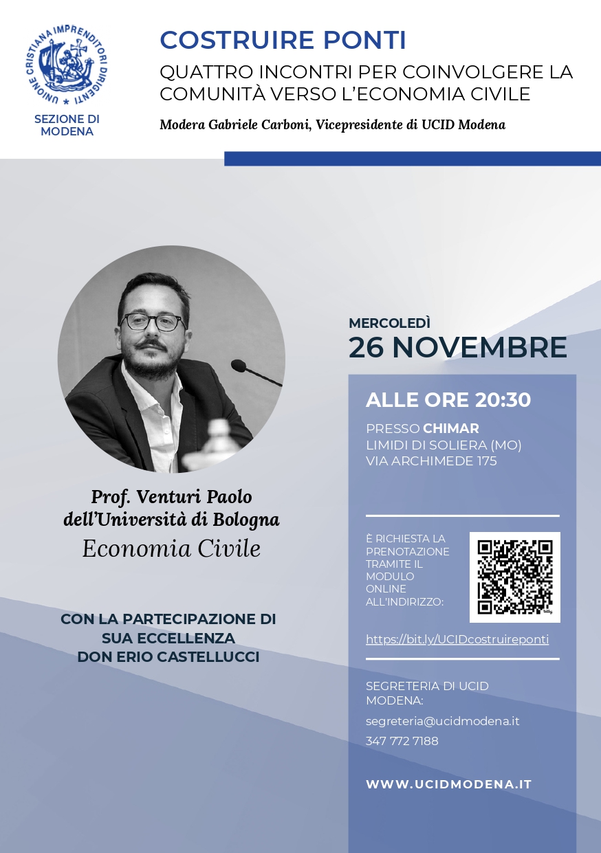 abbiamo il piacere di invitarLa al convegno promosso da UCID – Unione Cattolica Imprenditori e Dirigenti, Sezione di Modena, che si terrà il 26 Novembre 2025 alle ore 20,30, presso la sala convegni Chimar Lab presso Chimar S.p.A., in Via Archimede 175, Limidi di Soliera. Sarà presente il Nostro Arcivescovo Don Erio.