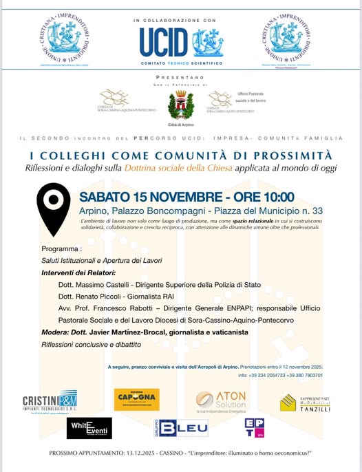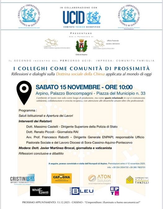 L’incontro, promosso dal Gruppo Giovani UCID Lazio e dal Gruppo Giovani dalla Sezione UCID Sora-Cassino “Donato Formisano”, con il patrocinio del Comune di Arpino, rappresenta la seconda tappa di un percorso di riflessione e dialogo sulla Dottrina sociale della Chiesa applicata al mondo di oggi.