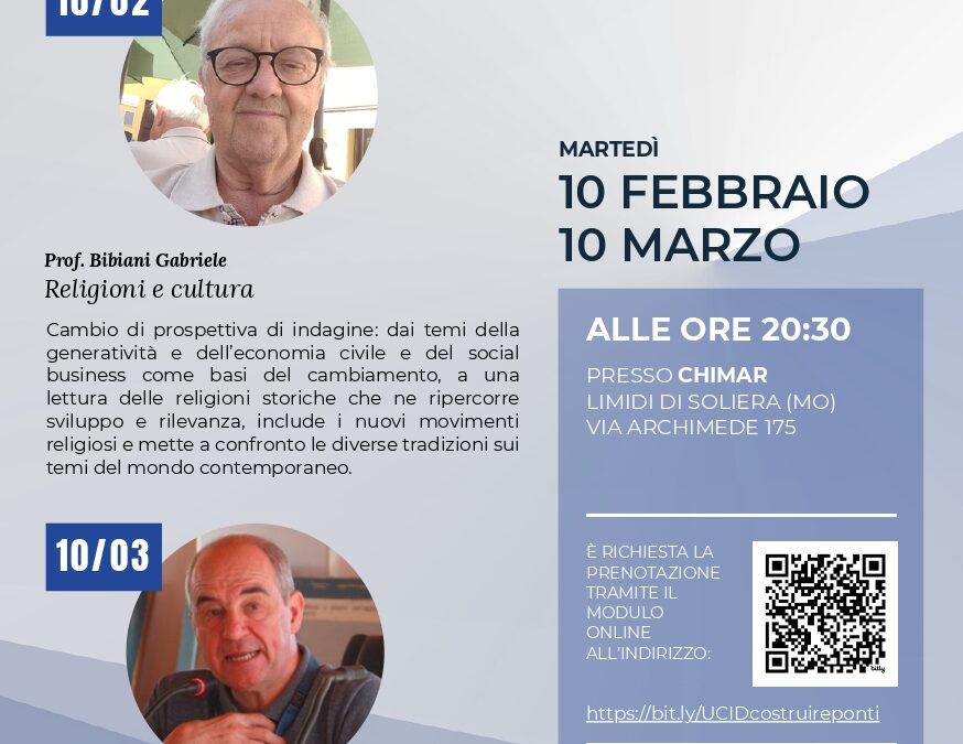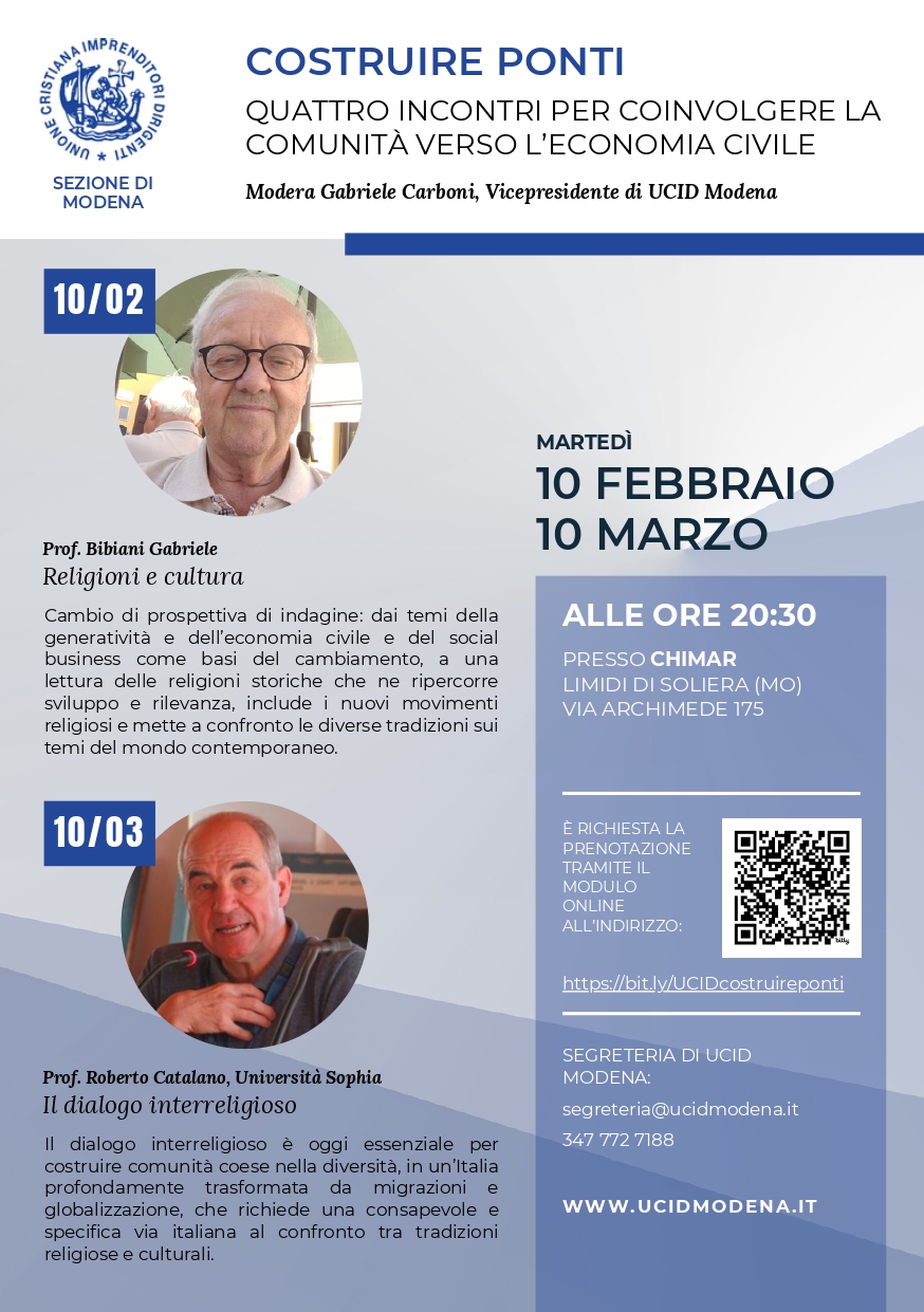 Abbiamo il piacere di invitarLa al convegno promosso da UCID – Unione Cattolica Imprenditori e Dirigenti, Sezione di Modena, che si terrà presso la sala convegni Chimar Lab presso Chimar S.p.A., in Via Archimede 175, Limidi di Soliera. Martedi 10 Febbraio 2026 ore 20,30.