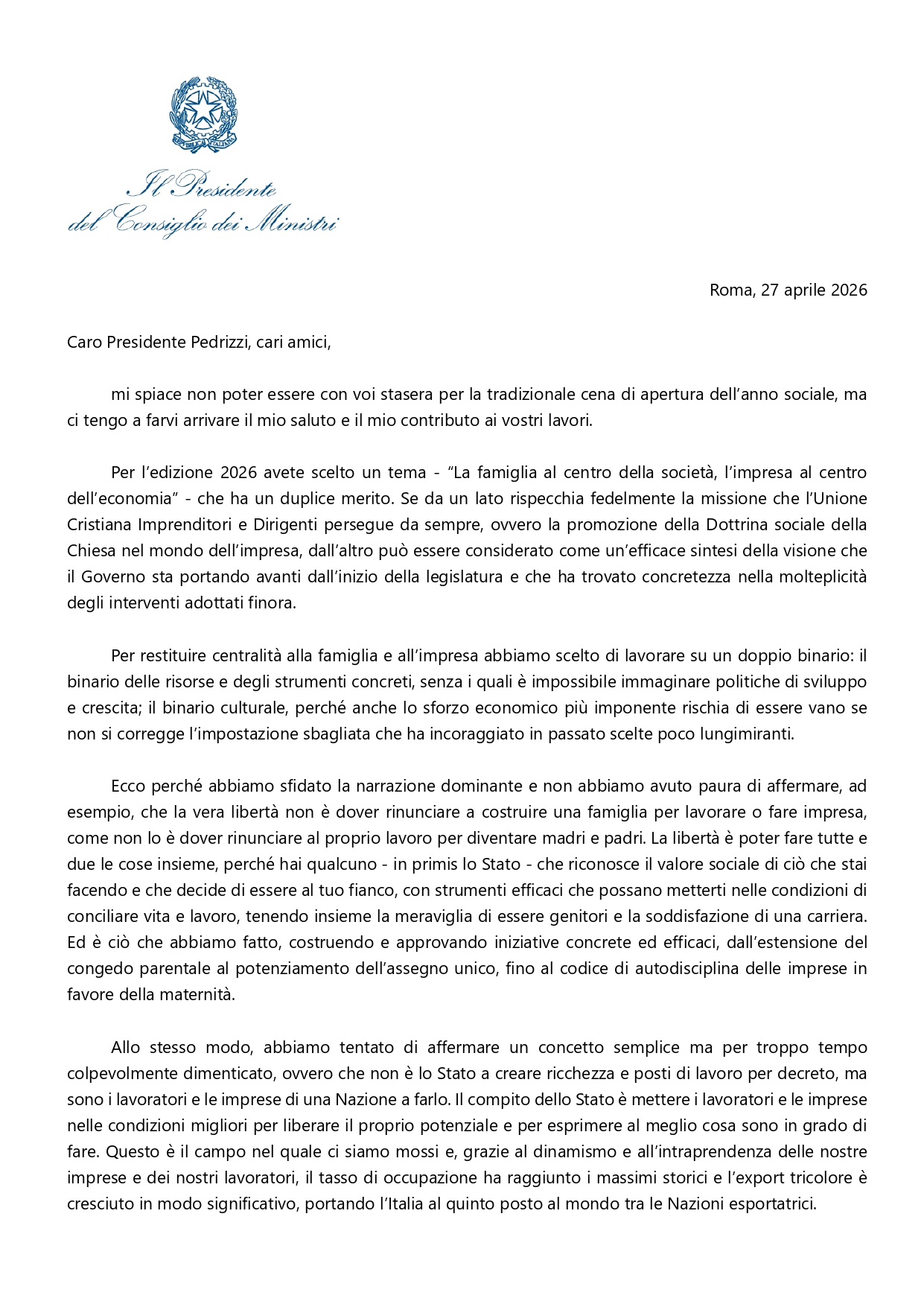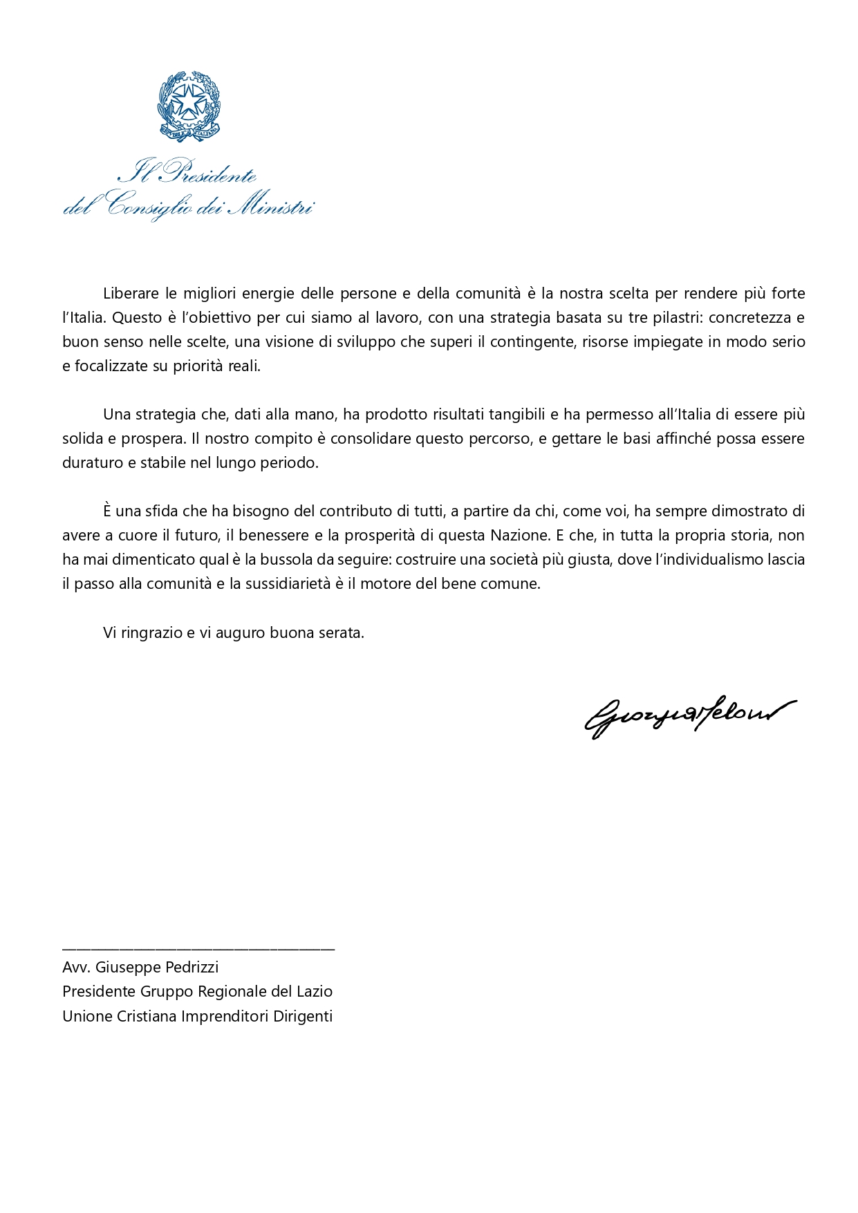 La lettera del Presidente del Consiglio, Giorgia Meloni, alla cena di apertura dell’anno sociale del Gruppo UCID Lazio.