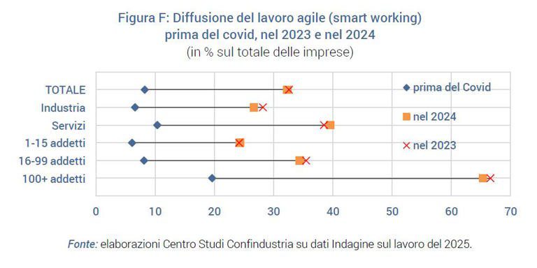 Il seguente grafico mostra la diffusione del lavoro a distanza nell’industria e nei servizi prima del Covid, nel 2023 e nel 2024. Viene inoltre indicata la distribuzione per classi di addetti (fonte Centro Studi Confindustria, Indagine sul lavoro del 2025).